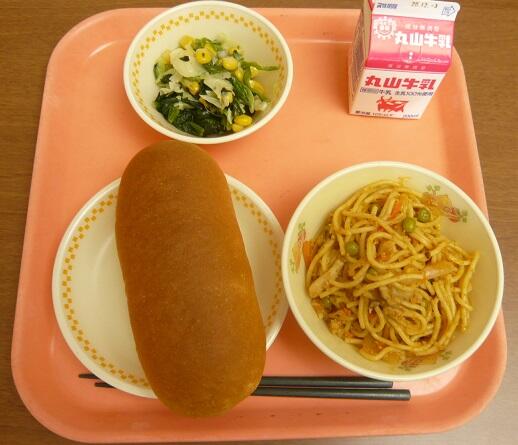 カレービーフンはたくさんの食材が入っており、子どもたちもカレー味なので大喜びでしょう。とくにイカがうれしかったです。コッペパンとの相性も抜群です。マヨネーズ和えもほどよい味付けでした。