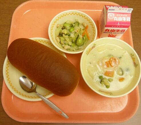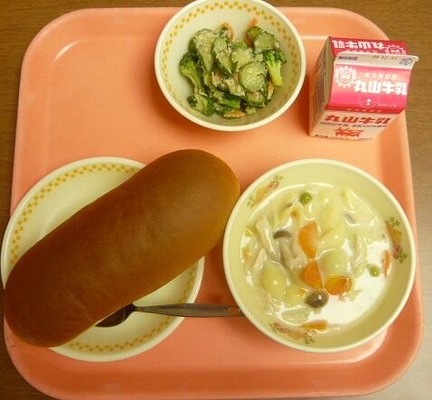 3月11日 クリームシチュー セサミサラダ 黒糖パン 牛乳