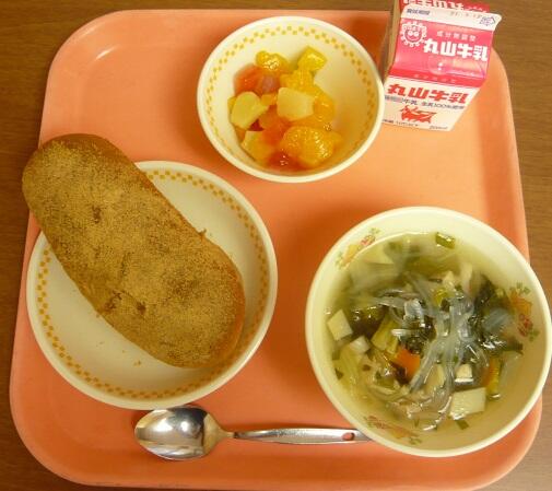 3月8日 揚げパン マロニースープ フルーツミックスゼリー 牛乳