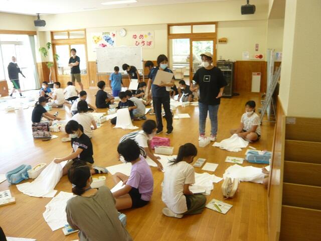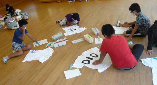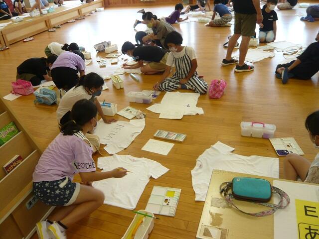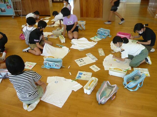 7月29日、5・6年生は「オリジナルTシャツづくり」に挑戦しました。講師は、本校の保護者であり筆文字アーティストとして活躍されている吉田しのぶさんです。まず自己紹介として、現在の活動に至るまでのお話がありました。将来に向けていろんな夢や目標を描いていく子どもたちにとって、実に興味深いお話でした。「自分の好きなことや自分が興味をもったこと、気軽にチャレンジすることなどを大切にしてほしい。」「小さな一歩が、一つの出会いが、自分の人生に大きく影響することがある。」などなど、心にのこります。子どもたちは、真っ白なTシャツに、専用の絵の具で描いていきました。大胆に筆を走らせる子、おっかなびっくり進める子、それぞれです。楽しそうに活動していました。さて、どんなTシャツが完成するのでしょうか!