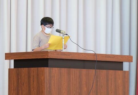 まず、代表作文では、4年生の日髙幸咲さん、6年生の中野藍輝さんが、発表しました。1学期のがんばったことや課題についいて、作文の内容に加えて、堂々と落ち着いて表現する態度が立派でした。