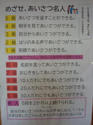 これを見て、自分のあいさつを意識してくれるといいなあと思います。また、自分のあいさつは、どの級かな?と振り返ってくれるとうれしいですね。