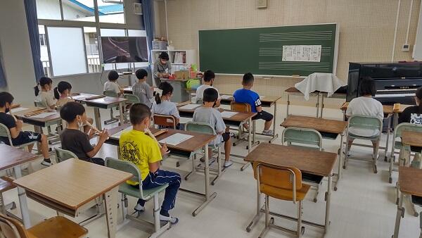 新しくなった音楽室に楽器や机などを搬入し、今日から授業が新音楽室で行われました。音楽室を覗くと3年生がリコーダーの練習をしていました。音楽室の横には大きな木が茂り、暗かったのですが、先日の奉仕作業で玉田くんのおじいちゃんが高所作業車を使い、剪定をしてくださったので、教室は大変明るくなりました。玉田さんありがとうございました。