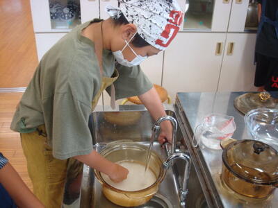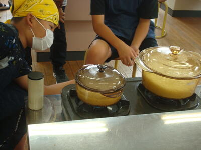 6年生は1・2時間目に、5年生は3・4時間目に行いました。お米は5年生が収穫してくれたお米を使って、透明な鍋で炊いたものです。