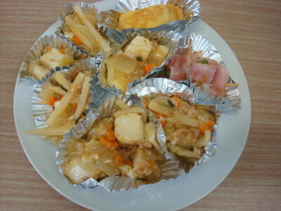 5年生は、じゃがいもを使った料理、6年生はサラダや肉じゃがなどを作っていました。作った料理は、自分の弁当箱に入れて給食時間に食べました。