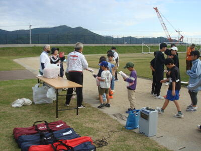 ↑ スタート前の練習中の様子 初めてする人もいたと思いますが、まずはやってみるという姿勢がいいですね。競技中は、チームの点数係をしてくれている6年生もいました。おじいちゃん・おばあちゃんたちの役に立ちましたね。