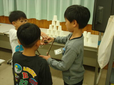 ↑ 輪ゴム弓矢に、松ぼっくりをはめるやり方を教えています。紙コップタワーを全部倒すと、手作り景品があったようです。