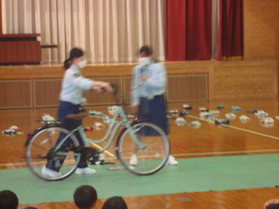 7月12日に交通教室を全校一斉で行いました。交通指導員の方々を中心に、歩くときに注意することの説明、信号機ありの横断歩道の渡り方、自転車の点検の仕方、自転車の乗り方を4つを学習しました。