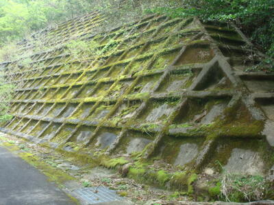 ↑ のり面には、上の写真のようにパイプが埋め込まれて、山にしみ込んだ水を排水しています。この排水の色が茶色の時は、土砂崩れの前触れと聞いたことがあります。排水の色に注意しましょう。