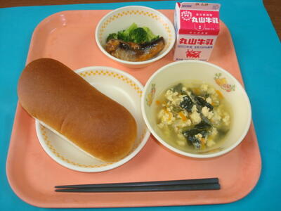 ↑ 今日の給食は、ミルクパン、牛乳、イワシのトマト煮、ゆでブロッコリー、ふわふわスープでした。