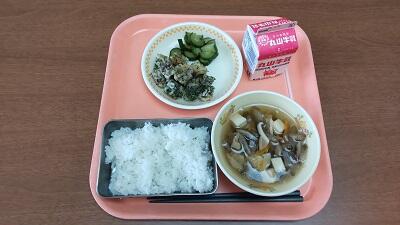 今日の献立は、牛乳、ごはん、アジの磯辺揚げ、キュウリのコロコロ漬け、つぼん汁です。