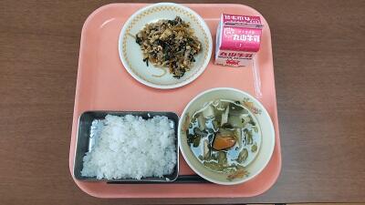 6月に入りました。今日の献立は、いためビビンバ、ちんげんさいスープ、牛乳、ごはんです。