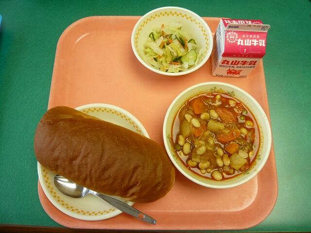 一日中雨が降りしきる月曜日、ポークビーンズがよりおいしく感じました。サラダは、パインとハムが野菜の味をより引き出します。