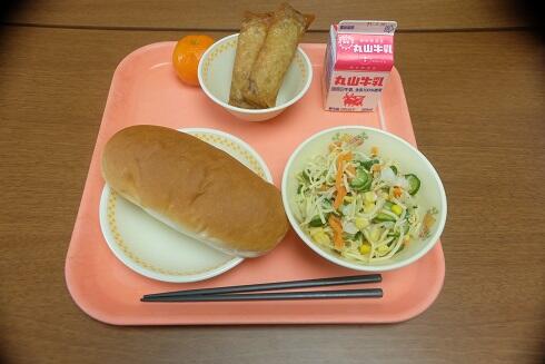 今日の献立は冷やし中華、揚げ春巻き、冷凍みかん、牛乳、