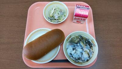 今日の献立は、いもっこパン、豚肉のごま味噌マヨネーズ、マロニー