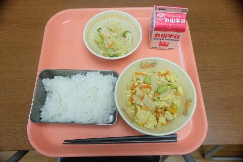 今日の献立は、ご飯、牛乳、いり豆腐、千切り大根のピリ辛和えです。
