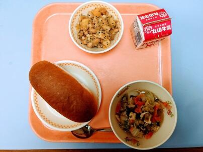 今日の献立はコッペパン、牛乳、八宝菜、いもと大豆の揚げにです。八宝菜は言葉のとおり、たくさんの野菜が入っており、とろみがきいていてとてもおいしかったです。いもと大豆の揚げ煮は、お芋が甘くて、子どもたちが好んで食べるような味でした。