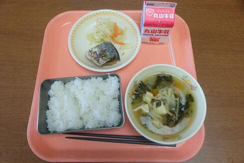 今日の献立は、ご飯、牛乳、鯖の生姜煮、ごま酢和え、小松菜の味噌汁
