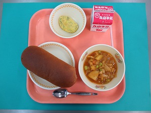 今日の献立は、黒糖パン、牛乳、鶏肉と野菜のカレー煮、ほうれんそうオムレツです。
