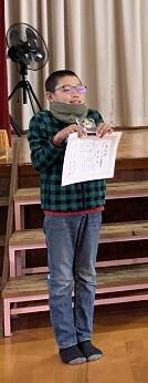 その後、3年生の酒井ゆうまさんの表彰を行いました。一行詩「生命いのちのこえ」コンテストにおいて、見事な入選です。