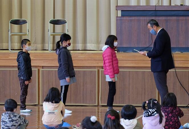 6つめは、転出する伊東兄弟のあいさつを行いました。緊張しながらも、全校のみんなへ立派な言葉でお別れをすることができました。