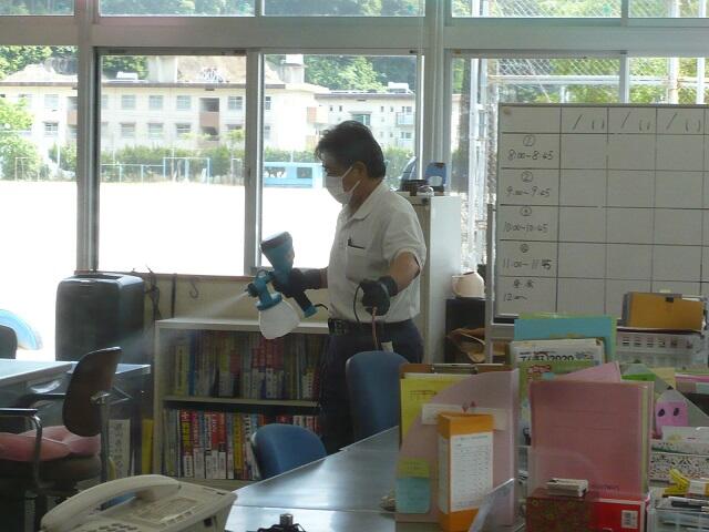 5月19日〔火〕午後、児童下校後に、「第一環境管理株式会社」の方々による消毒作業が行われました。各教室、特別教室、トイレ、職員室などなど、丁寧に消毒していただきました。延岡市内の小中学校を、ボランティアで回られておられます。子どもたちの安全な環境づくりのため、本当にありがとうございます!ケーブルメディアわいわい
