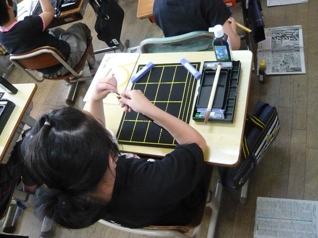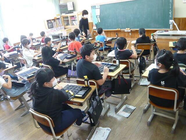 3年生は初めての習字です。習字道具の使い方を習っていました。