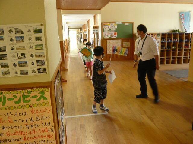 5月28日、1年生と2年生の生活の学習で「学校たんけん」がありました。2年生は、昨年の経験を生かして、今度は1年生をリードする番です。1年生の班を誘導する係や、各場所を説明する係などに分かれていました。お世話をする2年生も一所懸命、緊張しながらも話を聴いている1年生も一所懸命、よくがんばりました!