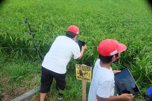 5年生はタブレットを持参し、田んぼや稲穂の様子を写真に撮って