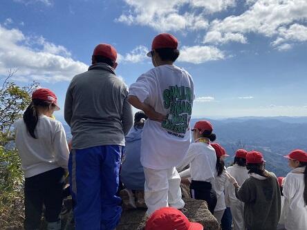 開所式後にすぐに子どもたちは行縢山を目指しました。自然の家から自分たちの登る行縢山の雄岳を眺めると「えー」「すげー」とかいろいろな反応が返ってきましたが、みんながんばって無事登頂にも成功し、全員けがもなく下山することができました。