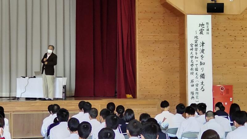 11日(金)に中学生と一緒に防災講話を行いました。1部では宮崎大学名誉教授 原田 隆典 様から「地震・津波を知り、備える」という演題で、地震や津波の起こる原因や、実際に南海トラフ地震が起こったときのシュミレーションなどについてお話をしていただきました。