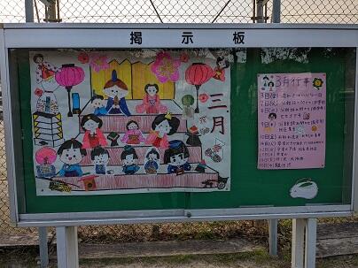 さて、今月の正門掲示は3年生の担当です。3月3日はひな祭りの日。かわいいかわいいひな壇飾りができあがっていました。ひな人形の並べ方やどんな道具があるかなどをインターネットで調べ、作成したそうです。とても上手にできています。