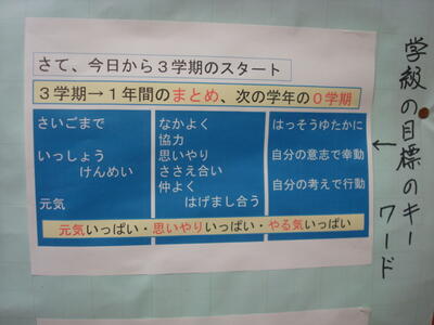 1月9日から3学期がスタートしました。病気欠席の児童がいたので全員が揃っての始業式とはなりませんでしたが、元気な姿がたくさん見れてよかったです。これから寒い日が続きますが、体調管理に十分気をつけましょう。