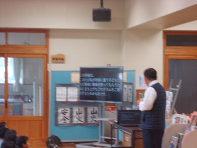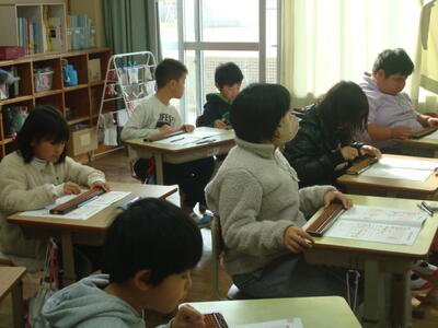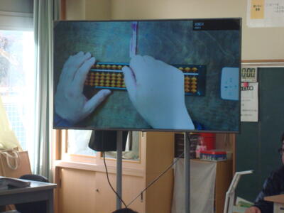 1月30日に、3年生へそろばんを教えに延岡市内の先生が来てくれました。休み時間には、金のそろばんや真珠のそろばん、昔のそろばん、外国のそろばん、目が見えにくい人用のそろばんなどを触らせてもらいました。授業においては、大型テレビを使って、足し算の時の珠の動かし方を見せながらゆっくり進めてくれました。