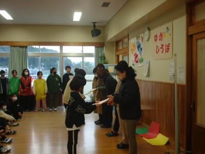 次に、給食を作ってくださる方(調理員さんへ)、準備してくださる方(学校技術員さんへ)、配膳の準備をしてくださる方(6年生へ)への感謝状の贈呈を行いました。