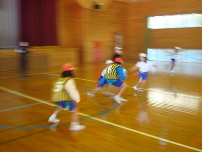 3年生は、体育でタグラグビーをしています。ラグビーボールを使って、トライしていくゲームですが、タックルとかの接触がないように、腰に付けているタグをとって、攻めを防御するゲームです。ボールを持っているときに、自分のタグがとられたら、ボールをはなすことになります。