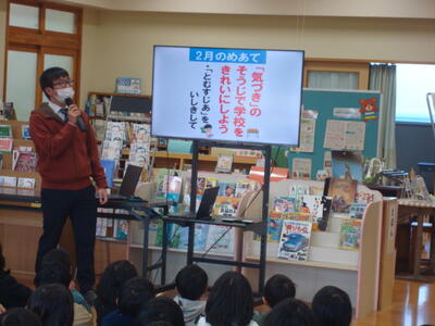 係の先生から2月の月目標に関するお話をしていただきました。2月の月目標は、「気づき」のそうじで学校をきれいにしようです。「とむしじあ」を意識してとあります。「気づき」とは、自分の目で確認して、どこを掃除したらよいか気づいて掃除しましょうということです。「とむすじあ」とは、掃除の合い言葉で、と:とりかかり む:むごん す:すみずみ じ:時間いっぱい あ:あとしまつの5つの視点です。多くの学校が、この合い言葉を使っていると思います。