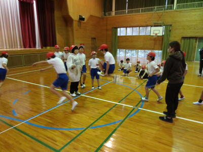 2月5日の2時間目の時間に全校一斉の縄跳び大会を開きました。最初に、各学年の代表児童による模範演技を行いました。代表児童の子たちは、自分で発表する技を決め披露してくれました。しかも、体育館のステージ上で、とても緊張したと思いますが、勇気を出してくれました。このことが少しでも自分の自信になってくれたらと思います。