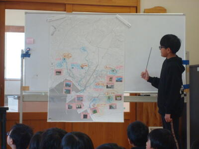 4年生は、タブレットを使って、パワーポイントを効果的に活用して、上の内容を発表しました。役割移動もスムーズで、伝えたいことをよくわかるもので、素晴らしい発表した。避難所の高さや海岸からの距離、経路を伝えた後、避難所への道は上り坂が多く、狭い道が多いこと、こけや落ち葉により滑りやすいことなど注意点も教えてくれました。今回は市振地区でしたが、みんなが住んでいる地区内の避難所も確認してみましょうね。