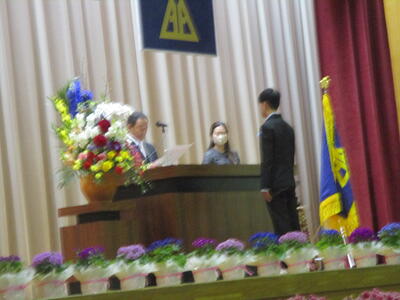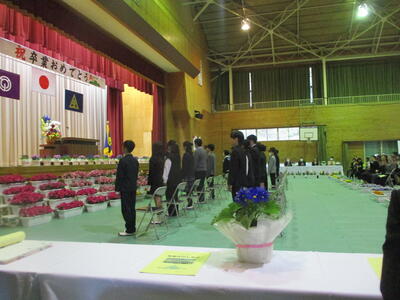 ↓ 出席番号1番の児童から順に卒業証書の授与です。出席番号1番の児童は卒業生番号 第6705号でした。君たちの先輩は6704人いるんだね。君たちの保護者の方は、第〇〇号かな