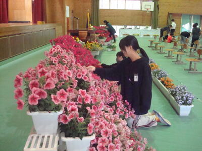 ↓ 体育館に並べた花のうち、枯れかかっている花びらを取っています。