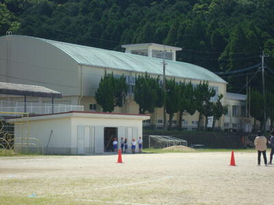 町の地震津波避難訓練とタイアップして、小中合同に津波避難訓練を最初に実施しました。その前には、南海トラフ地震が起きた場合の地震の構造と津波や机に潜る練習、教室から運動場へ避難するときの動き方を学年の発達の段階に応じて確認しました。