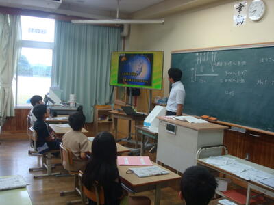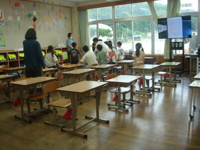 ↑ 画像を使って、地震の構造や津波のことなどを学んでいます。