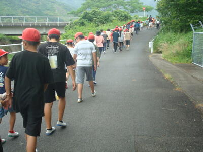 津波避難では、1・6年生が手をつないで歩いて避難し、2・5年生が手をつないで歩いて避難し、3・4年生が一緒に歩いて避難しました。余計な話をすることなく、避難することができました。