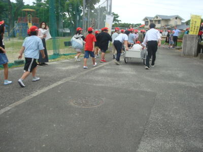 また、6年生にけがした子どもの役をしてもらい、リヤカーに乗せて避難することも確認してみました。