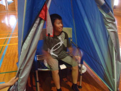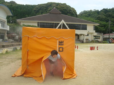 煙体験では、煙が充満したテントの中を進んでいきました。