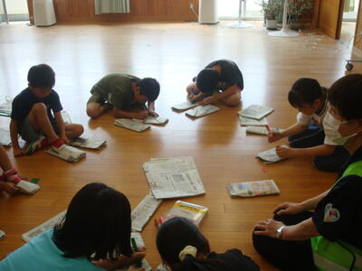 ↑ 作り終わった子は、自分の足にはめて確かめています。お家の人にも教えてくれるといいですね。