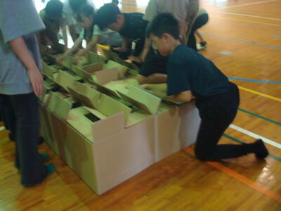 段ボールベッドの見本を見せてもらった後に、自分たちで段ボールベッドを作成しました。
