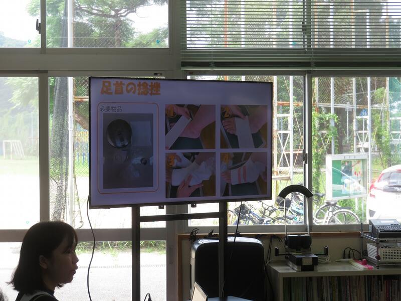 ↑本校の養教が中心になって、「養教不在時のけが等の対応について」の研修を行いました。保健室内にあるものを確認して外科・内科対応の仕方を学びました。