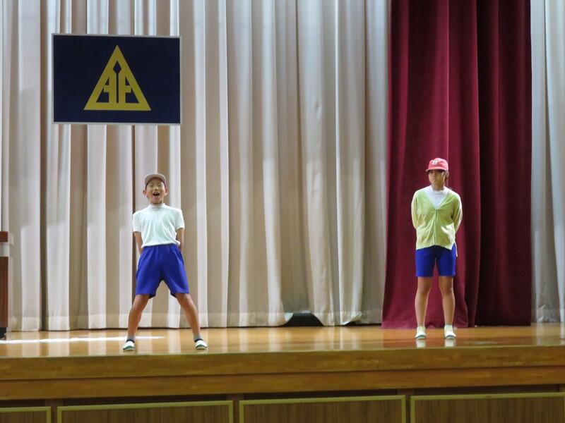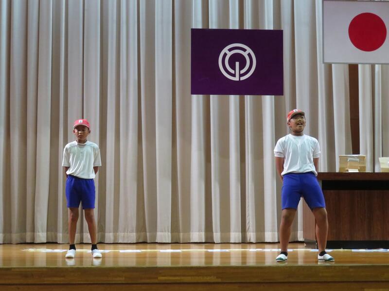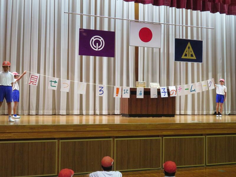 ↑運動会実行委員長の2人が意気込みを堂々と発表してくれました。その後、スローガンが発表されました。今年の運動会のスローガンは、「見せつけろ!北浦っ子のチームワーク」です。